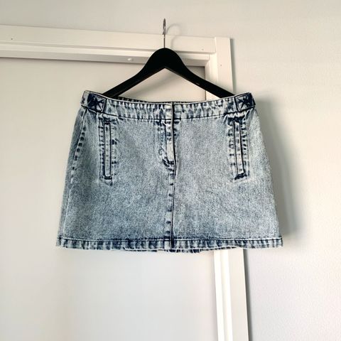 H&M Hennes farkkuhame naisille, koko 36. Sininen denim-materiaali. Lyhyt malli, jossa sivussa napit ja takana pieni nappitasku. Soveltuu arki- ja vapaa-ajan käyttöön.