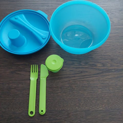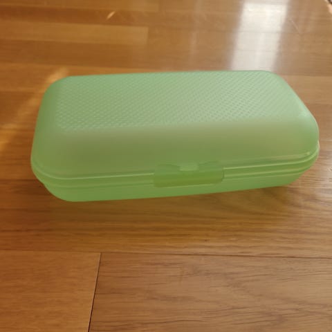 Tupperware eväsrasia vihreä muovi. Pieni suorakulmainen rasia, jossa saranoitu kansi ja etusuljin. Kannessa talviaiheinen piparkakkukuviointi. Soveltuu esimerkiksi lasten välipalojen tai pienten eväiden kuljettamiseen ja säilyttämiseen. Valmistettu kovasta muovista, helppo puhdistaa ja kevyt kuljettaa.