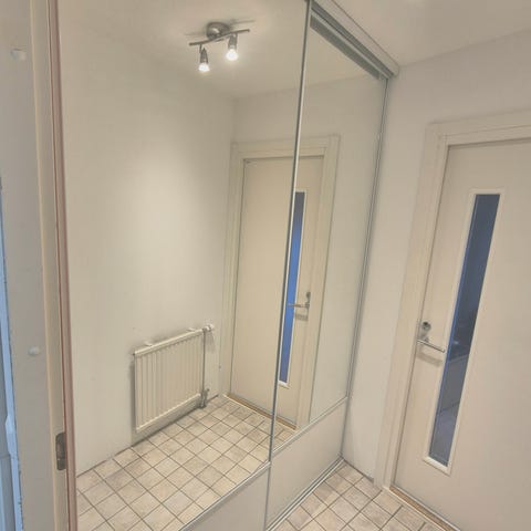 Liukuovet alumiinikiskoilla ja rungolla. Liukuovissa peiliovet yläosassa ja viiluosat alaosassa. Peiliosan korkeus 172 cm ja leveys 78 cm. Viiluosan korkeus 85cm ja leveys 78cm. Soveltuu esimerkiksi eteiseen tai makuuhuoneeseen. Kiskot tulevat mukana.