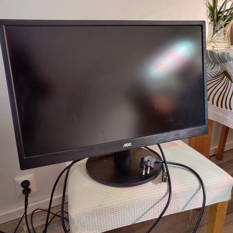 Hyväkuntoinen AOC 24" näyttö. Näytössä on jalusta, joka tukee korkeuden säätöä, kallistuskulmaa ja sivuttaissäätöä. Näytön ovh on 378,99€