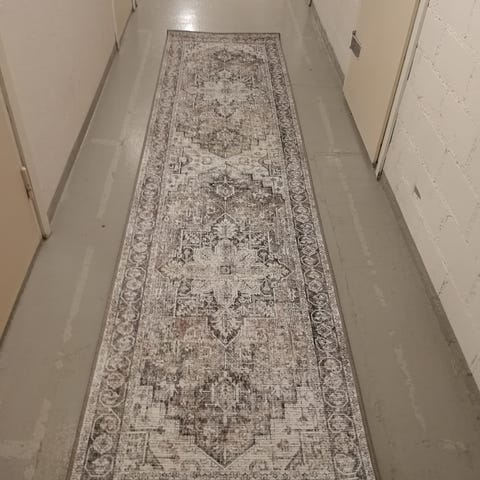 Musta käytävämatto, valko-harmaalla kuvioinnilla. Tahroja ei äkkiseltään löytynyt, ihan siistikuntoinen, imuroitu. Ei elukka- eikä tupakkatalous. Nouto Vipusenkadulta tai postitus.