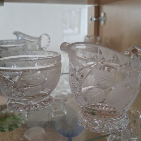 Lasinen sokerikko ja kermakko kaiverretulla koristekuviolla