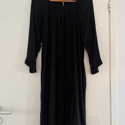 Nanso Iisi arkimekko naisille. Musta, lyhythihainen malli, jossa väljä ja laskeutuva helma. Koko 40. Materiaali 95 % viskoosia ja 5 % elastaania, mikä tekee kankaasta pehmeän ja hieman joustavan. Taskut sivuissa