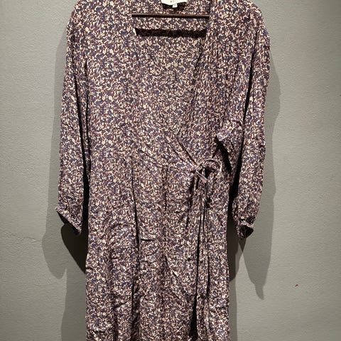 Vähän käytetty, oikein hyvässä kunnossa. Kaunis malli, epäsymmetrinen röyhelöhelma, pitkät hihat, iso v-aukko (tarvitsee topin alle), hieman krepattu epätasainen kangas, ei rypisty.