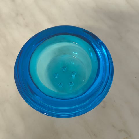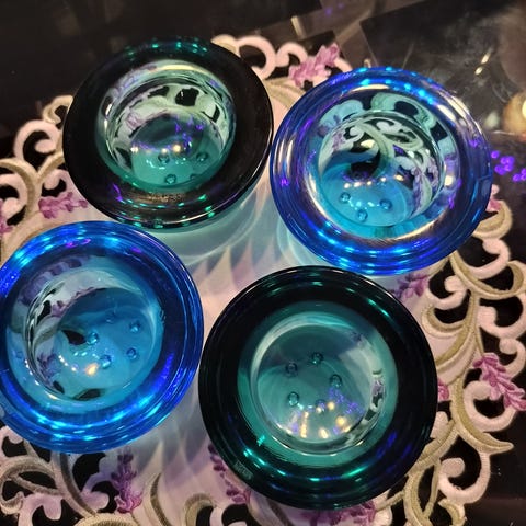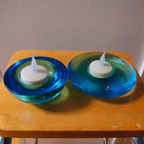 Myydään Iittalan Ballo-kynttilälyhty. Väri ultramarininsininen. Suunnittelija Annaleena Hakatie, sarja vuodelta 1995. Tuotteen halkaisija 9,4cm.
