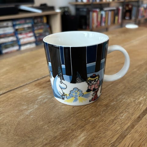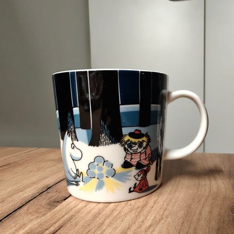 Muumimuki lumilyhty. Oikein siisti kunto, muutamasti tästä kahvit juotu muuten viettänyt aikaa vitriinissä.