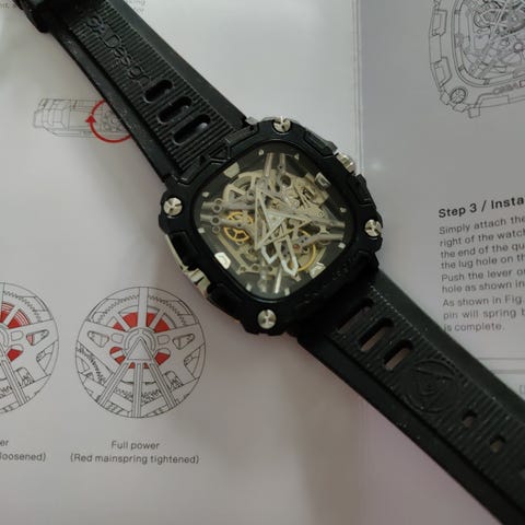 Full set eli mukaan laatikko, pienempi matkaboksi, takuukortit (03/2022) sekä COSC-sertifikaatti. Mukana myös toinen alkuperäinen Brellumin kumiranneke.