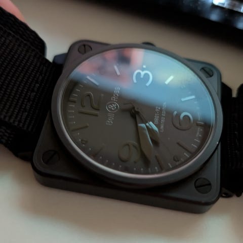 GMT-toiminto, musta DLC-pinnoitettu kuori, Brellumin BR-893-GMT -koneisto (COSC), joka perustuu ETA 2893-2:een. Hyvässä kunnossa ja toimii moitteettomasti.