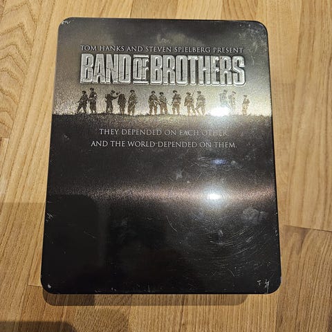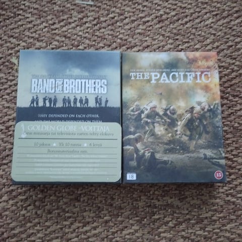 Band of Brothers ja The Pacific Blu-ray -sarjat. Molemmat ovat toisen maailmansodan aikaan sijoittuvia draamasarjoja. Pakettiin sisältyy kaksi erillistä Blu-ray-koteloa, joissa kummassakin sarjan kaikki jaksot. Tämä edellinen on tekoälyn luoma kuvaus. Tästä lähtisi kaksi klassikkoa samoilla kustannuksilla. Plus postikulut.