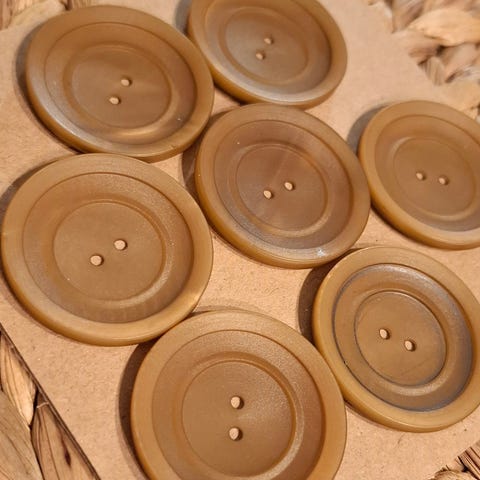 3 muovista nappia. Myynnissä myös samanlaiset keltaisenruskeat (7 kpl). Yhden napin halkaisija 3,5 cm. Nouto Roihuvuori tai sitten Toridiili.