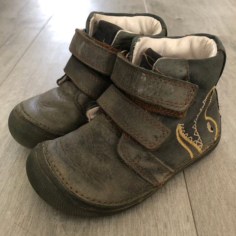 25. Nahkaiset paljasjalkakengät. Jonkin verran tummentumaa. Sisämitta 16 cm.