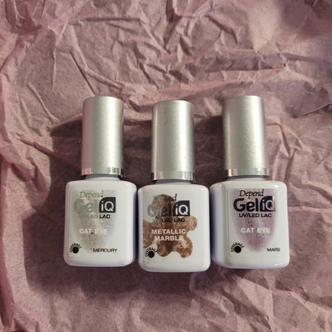 Myyntiin Dependin GeliQ uv/led lac kynsilakkoja. Kolme kappaletta. Väreinä metallic marble topaz, cat eye jupiter ja cat eye saturn. Uudet ja käyttämättömät.