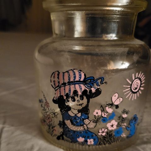 Vintage lasipurkki jonka kannessa linnut ja pesä.