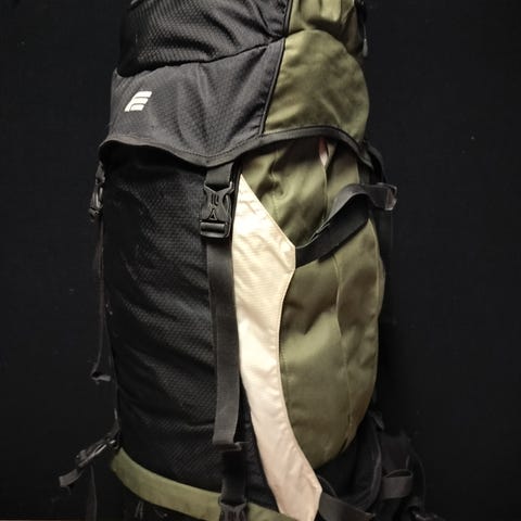 Vähälle käytölle jäänyt tukeva rinkka. Selkäpuolella hieman kulumaa, muuten hyvässä kunnossa. Pakkaustilan voi jakaa kahteen osaan avattavan välipohjan avulla. Rinkan saa auki päältä, edestä ja alaosan kautta. Paljon taskuja. Mukana myös sadesuoja. Tilavuus 50+10 l. Postitus tai nouto Roihuvuoresta.