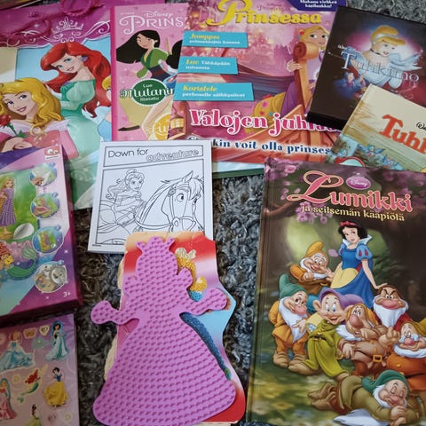 Disney prinsessojen luontokortit. Pakkauksessa on useita värikkäitä kortteja, joissa on luontoaiheisia kuvia. Kortit on kiinnitetty renkaaseen, joka helpottaa säilytystä ja mukana kuljettamista. Soveltuu lasten leikkeihin ja oppimiseen, esimerkiksi lajien tunnistamiseen ja sanavaraston harjoitteluun. Tarrakirja jossa osa tarroista jo liimattu