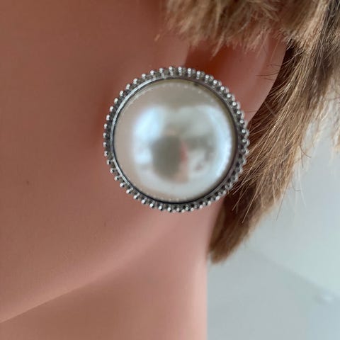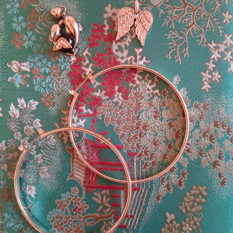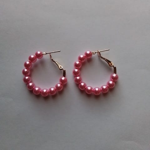 Hienot isot korvakorut roikkuvilla vaaleanpunaisilla ”helmillä”. Halkaisija 6cm. Erittäin hyväkuntoiset!