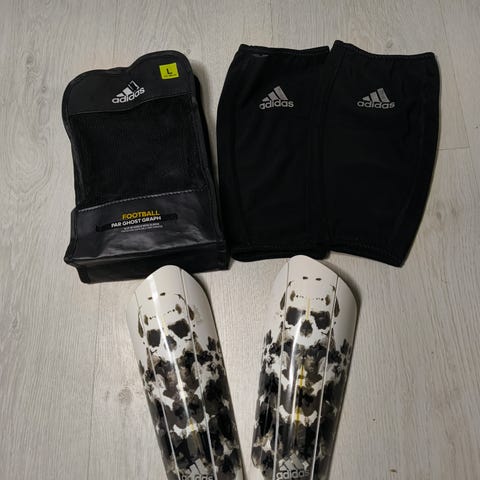 Tyylikkäät valkoiset mustilla "ghost graph" -kuvioilla varustetut adidas-säärisuojat. Kevyet, joustavat ja hyvin muotoillut – liukuvat suoraan sukkien sisään (slip-in), mutta mukana myös mustat kompressiosukat/hihat, jotka pitävät suojat paikallaan ja antavat lisätukea. EVA-pehmuste takaa hyvän iskunvaimennuksen ja mukavuuden koko pelin ajan. Mukana alkuperäinen Adidas-säilytys-/kantopussi (mesh-materiaalia, keltainen koko XL -tarra).