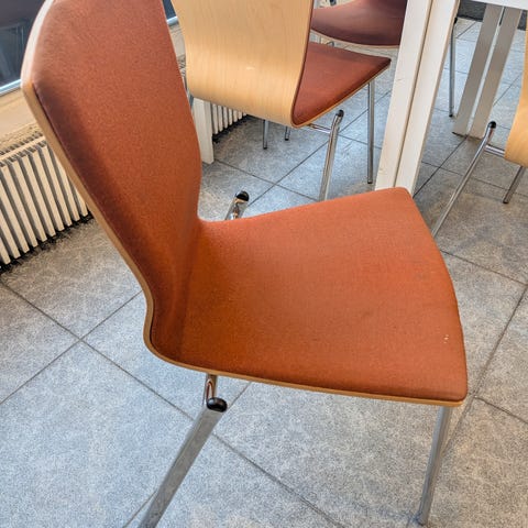 Olof Ottelinin suunnittelemat koivuiset Sirena tuolit. Tukevat ja ehjät, tosin uudella lakkauksella tulisi pränikät. Verhoilussa pientä kulumaa, väri on mid century tyylinen persikka.