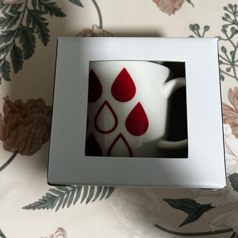 Arabia muki, jossa sinisävyinen kuvitus ulkopinnalla ja valkoinen sisäpuoli. Materiaalina keraaminen posliini. Soveltuu esimerkiksi kahvin, teen tai muiden juomien tarjoiluun arjessa ja kattauksissa.