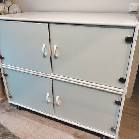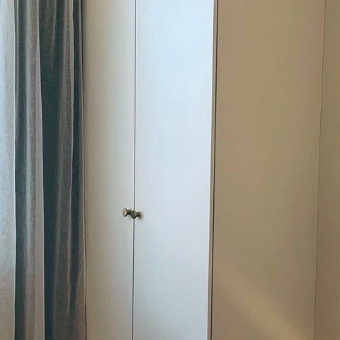 Mukana 3 hyllyä ja vaatetanko. Kauppaan kuuluu ovet saranoineen ja vetimineen, samoin sokkelin peitelevy edessä ja oven avaukseen sivu täytepala. Jalat on säädettävät, mutta hyvä huomioida että vaikuttaa etusokkelin istuvuuteen jos haluaa korkeutta muuttaa.