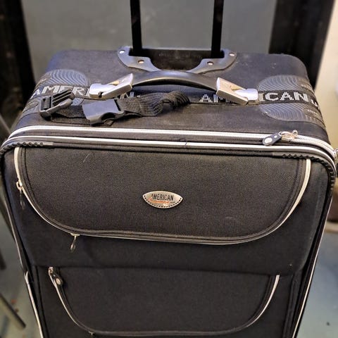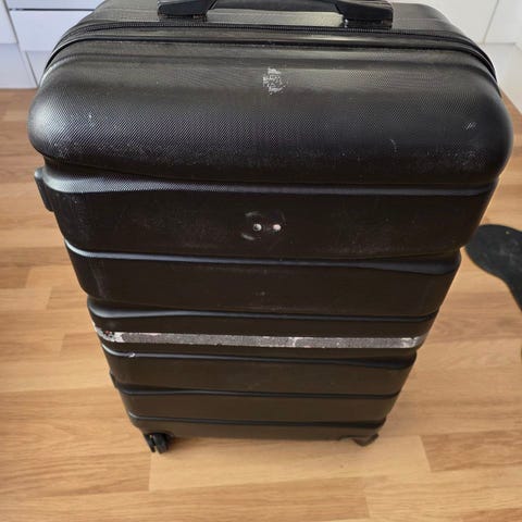 Pinnassa on pientä värjäymää (ks. kuvat), jotka tulleet käytössä, eivätkä vaikuta käyttöön. Vetoketjut ja pyörät toimivat moitteettomasti.