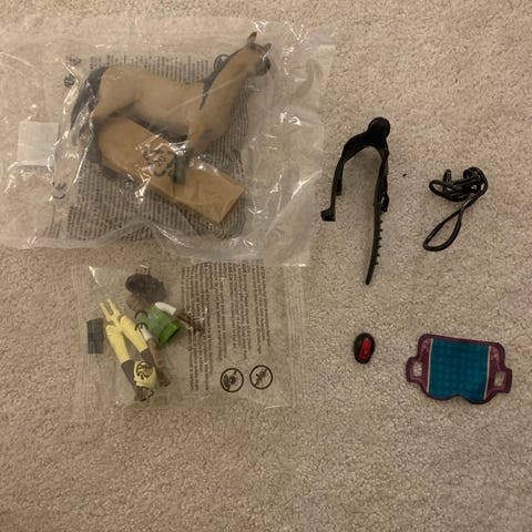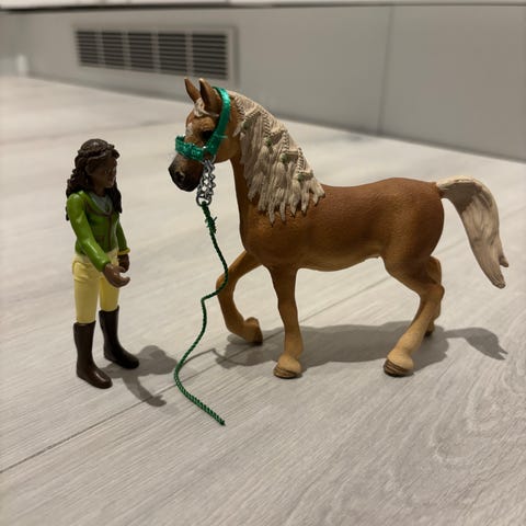 Schleich setti Sarah ja Mystery. Ratsastajalla on liikkuvat nivelet, mutta kypärä puuttuu.