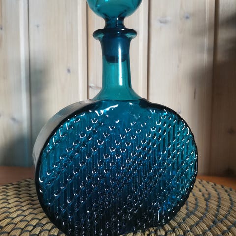Nanny stillin suunnittelemat bodega koriste pullot jotka valmistanut Riihimäen lasi. Molemmat pullot virheettömiä. Pullojen värit ovat ruskea/Amber ja oliivin vihreä. Ruskeassa pullossa vielä Riihimäen lasin tarra paikoillaan. Pullojen korkeus 28.5 cm.