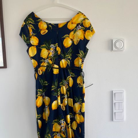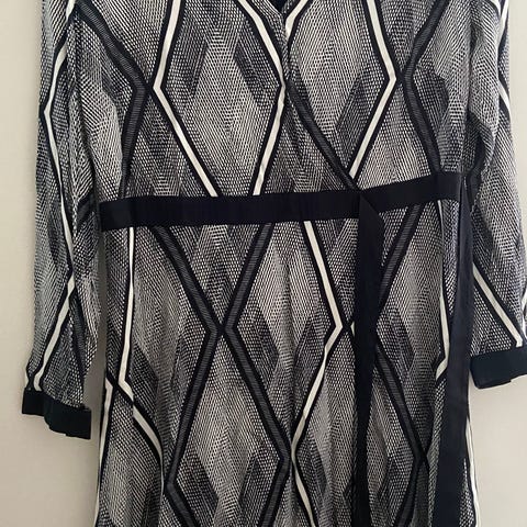 Koko 42. Kai-kai 50, vyötäröltä 45, pituus 102cm. Irrotettava solmittava vyö. Sivutaskut saumoissa. Pesty ja silitetty. Kaapissa seisonut.