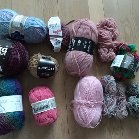 Neljä kerää Novita Pehmoinen lankaa, väri valko-viininpunainen. Samaa värjäyserää