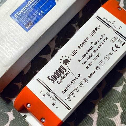 Mean Well HLG-240H-24A virtalähde. Lähtöjännite 24 V DC ja nimellisteho 240 W, lähtövirta enintään 10 A. Syöttöjännite 100–240 V AC (myös 277 V AC, Pohjois-Amerikka). Taajuus 50/60 Hz. IP65-suojausluokka, soveltuu kuiviin, kosteisiin ja märkiin tiloihin. Virtalähteessä on verkkojohdon liitin ja toisessa päässä haarukkaliittimillä varustetut johdonpäät kytkentää varten.