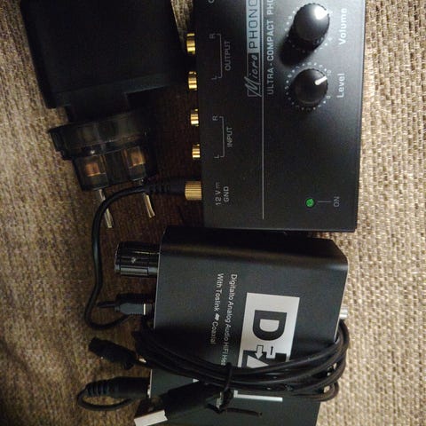 Mukana äänikortti/kuulokevahvistin ja USB-kaapeli (USB-A - Micro-USB). Takuu on jo vanhentunut.