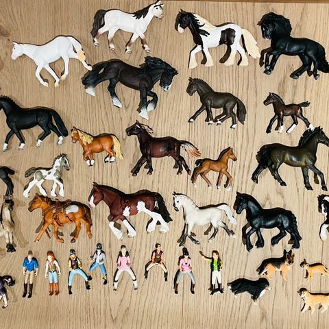 Schleich tyyppinen setti mutta Papo merkkinen. Kylmäverinen tupsujalka ja varsa, aitaus, hoitaja ja kaurasäkki.