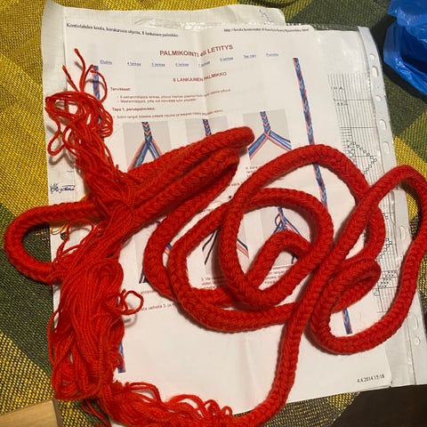 Myynnissä tuuterinpuvun essun keskeneräinen essun koristenauha välineistöineen. Todella taidolla ja tarkasti tehty! Pituus n.2m.