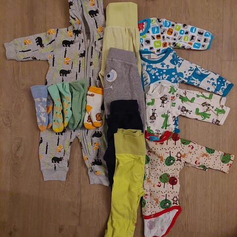 Bamse by Lindex velourasu, 2 bodya, housut, hame, lyhytlahkeinen kesäasu ja sukkahousut vaaleanpunaisen sävyissä.
