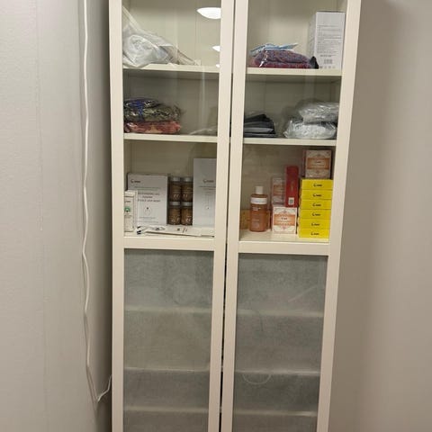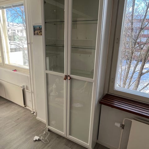 Valkoinen lastulevykaappi harmaareunaisilla lasiovilla. Kaksi ylintä hyllyä ovat irrotettavat. Vain haku.