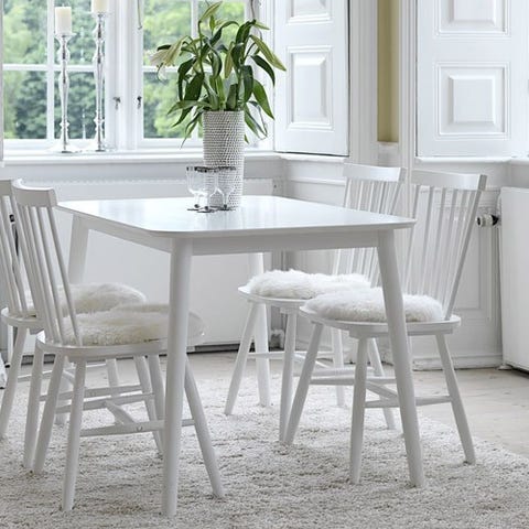 Myydään kuvan valkoinen Jyskistä ostettu Langdal pöytä 77x118. Pöydän jaloissa hieman tuolien hankaamia jälkiä. Nouto Etu-Lyötystä.