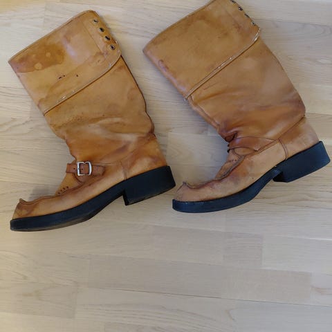 Vanhat kokonahkasaappaat. Kumipohjatut. Ilmeisesti täysin käyttämättömät. Postikulut 7e.