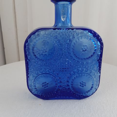 Erinomaisessa kunnossa oleva kirkas Grapponia pullo. Tässä Nanny Stillin Riihimäen lasille suunnittelemassa pullossa on tarra tallella.