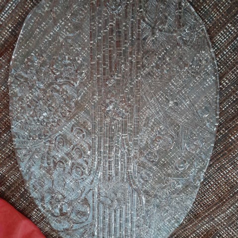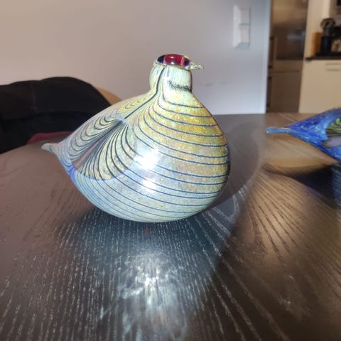 Oiva Toikan Nuutajärvelle suunnittelema signeerattu Riippu lasitaulu, halkaisija yli 25 cm. Valmistettu 1975-1980. Luultavasti tekovaiheessa valaessa syntynyt ura näkyy kuvissa, sekä massassa on muutama ilmakupla. Tuote on ehjä, ura ei ole halkeama.