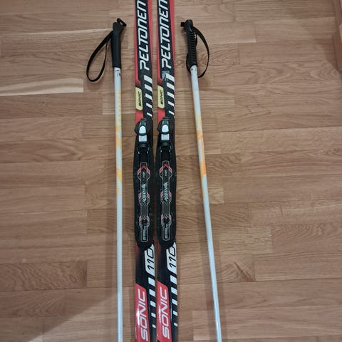 Lasten hiihtopaketti. Sukset 110 cm. Sauvat 85 cm ja monot kokoa 29