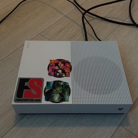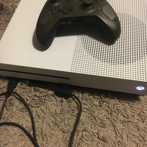 Microsoft Xbox One S pelikonsoli valkoinen. Kuvassa näkyy valkoinen konsoli sekä kaksi ohjainta, joista toinen on valkoinen langaton ohjain ja toinen musta ohjain johdolla. Konsolissa on levyasema. Soveltuu television tai näytön kanssa käytettäväksi viihde- ja pelikäyttöön. Tarkemmat tekniset tiedot, tallennustilan koko ja mukana tulevat kaapelit eivät käy ilmi tiedoista.