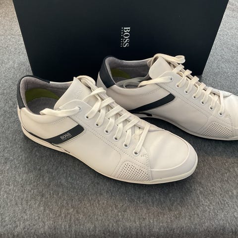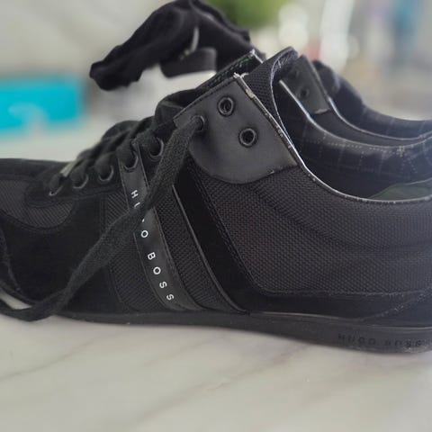 Hugo Boss tennarit, koko 44. Käytetty väin muutaman kerran. Väriltään mustat, sivussa ja kannassa kultaiset Boss-logoyksityiskohdat. Päällinen näyttää olevan tekstiili- ja synteettistä materiaalia, pohja kumia. Nauhakiinnitys. Sopivat arkikäyttöön ja vapaa-aikaan.