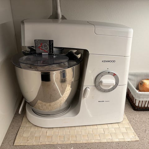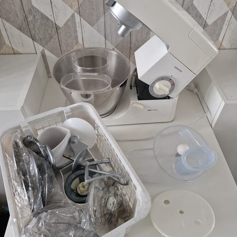 Kenwood monitoimikone teräskulholla. Laitteessa on suuri ruostumattomasta teräksestä valmistettu kulho sekä useita vatkain- ja sekoitusosioita, kuten vispilä ja taikinakoukku. Mukana tulee lisäksi käyttämätön lihamylly lisäosa ja mehumaija.