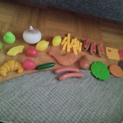 Kuvan muoviset leikkiruokatarvikkeet. Esineiden pituudet n. 5-7 cm.