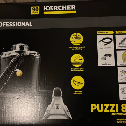 Kärcher Puzzi 8/1 C tekstiilipesuri. Ammattitason painehuuhtelukone tekstiilipintojen, kuten mattojen, auton penkkien ja huonekalukankaiden puhdistukseen. Laitteessa on erilliset puhdas- ja likavesisäiliöt, pitkä sähköjohto sekä imuletku käsisuulakkeella. Mukana tulee myös varsi lattia- tai mattosuulakkeelle. Vähäisellä käytöllä ollut ja hyvässä kunnossa.