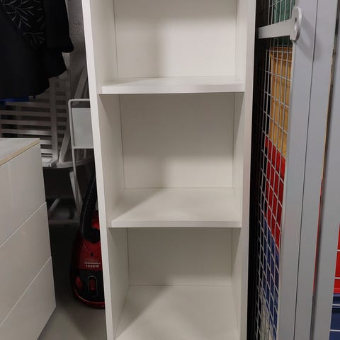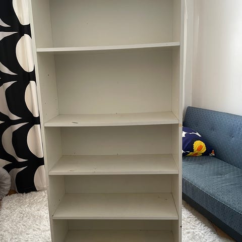 IKEA kirjahylly, väri valkoinen. Kapea ja korkea malli, kuvassa mitat. Näitä on 2kpl:tta. Toisessa ollut jo uutena haalea viiru pitkin matkaa taustalevyssä (tästä kuva). Useita hyllytasoja kirjoille, säilytyskoreille tai muille tavaroille. Soveltuu esimerkiksi olohuoneeseen, makuuhuoneeseen tai työhuoneeseen säilytys- ja esillepanokalusteeksi. Nouto Ritaharjusta, luhtitalon yläkerta. Omat kantajat mukaan, kevyet hyllyt.