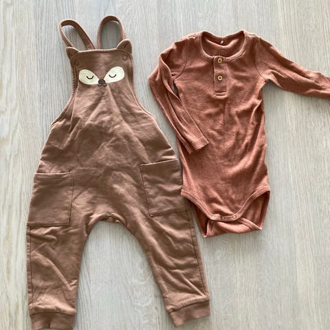 Myydään hyvässä kunnossa olevat lappuhaalari ja body koossa 86.