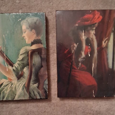 Vanhat taulut kolme eri kokoa isoin taulu korkeus 41cm, leveys 26.5cm. kaksi samankokoista korkeus 41cm, leveys 14cm.