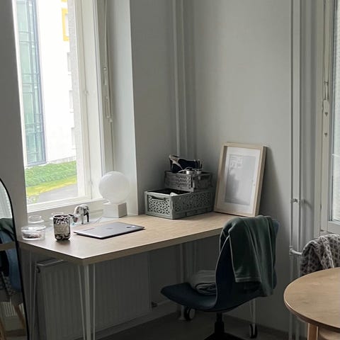 Valkoinen työpöytä kaapilla ja laatikolla. Pöytätason koko noin 120x55 cm. Ostettu Kallen-Kalusteesta - todella jämäkkää laatua.