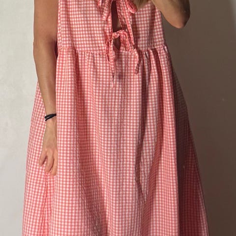 Koko L. 100% puuvilla. Hihansuissa kuminauha. Kai-kai 56, olka-helma 118. Vyötärön yp: 115. Pinkki/valko